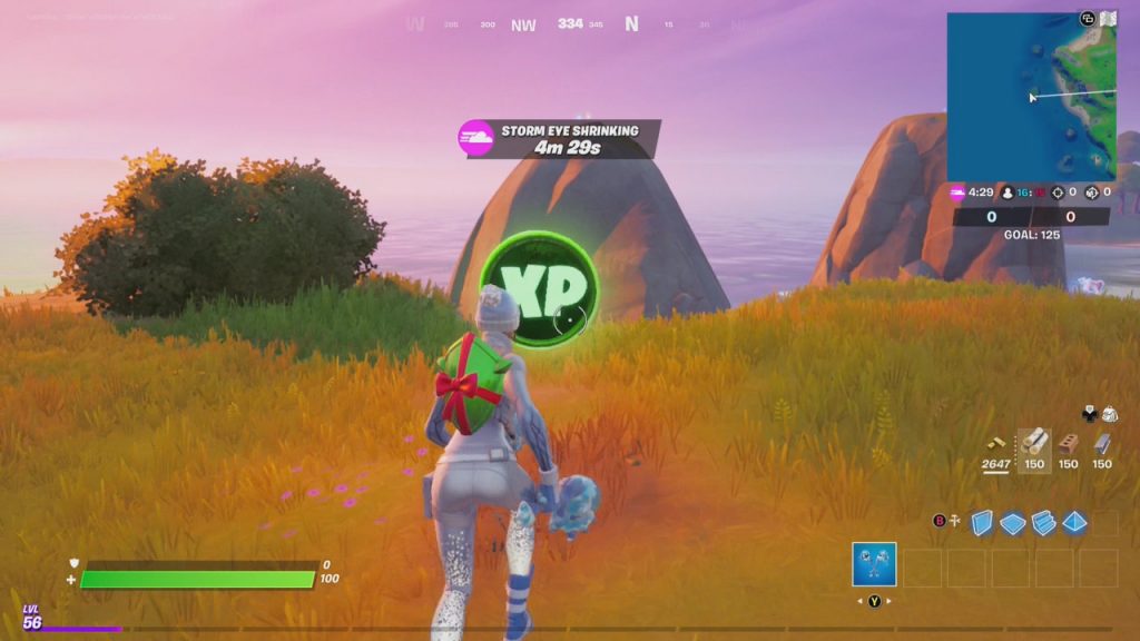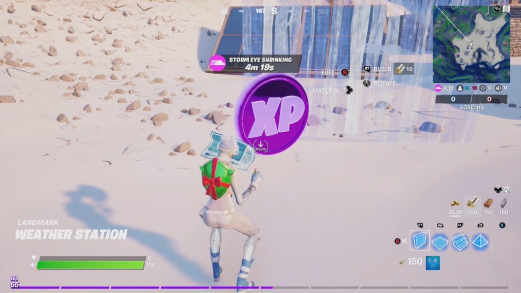 P1: There are two purple XP coins. As with prior seasons, when you activate a purple coin, it will break up into many smaller purple coins. If you collect all the purple coin fragments, you will be awarded 10,300 XP. Our recommendation is to build a box to collect all the fragments. The first purple XP coin is located near the Weather Station.