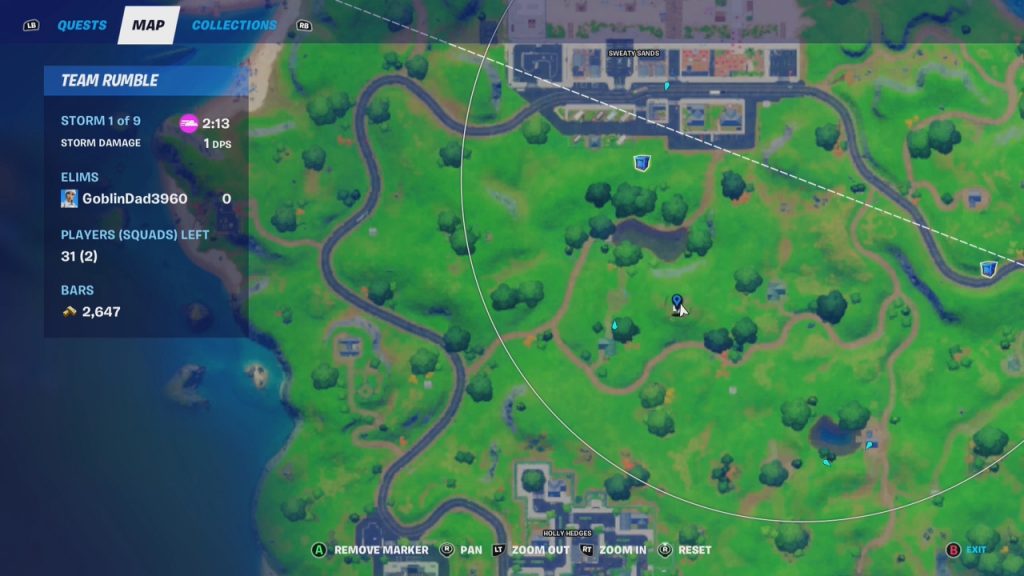 GR2: The second green XP coin is located on the heart-shaped island West of Sweaty Sands. We recommend landing at this location because sometimes, it’s hard to build in water.