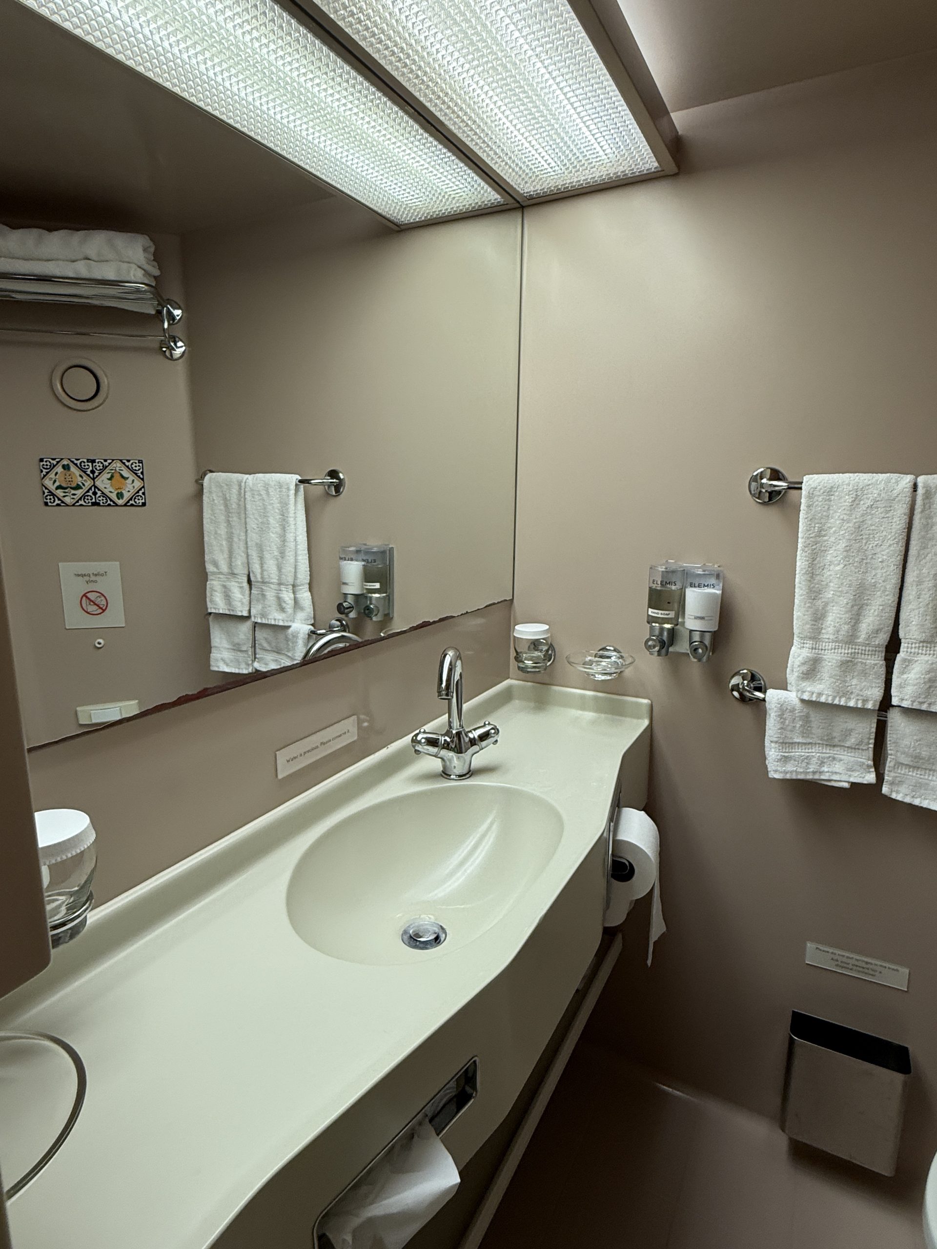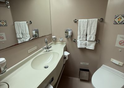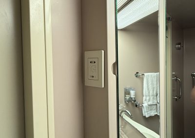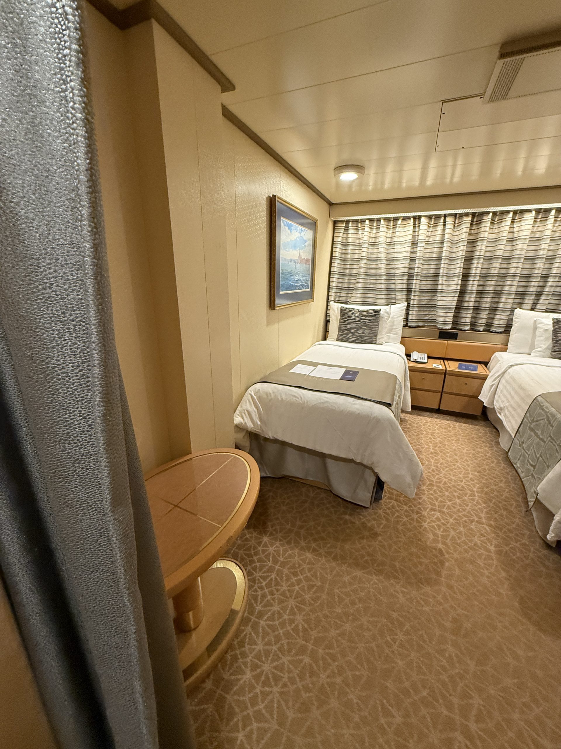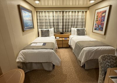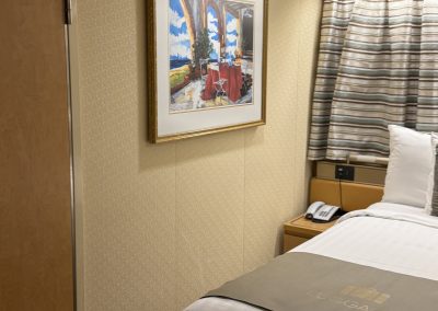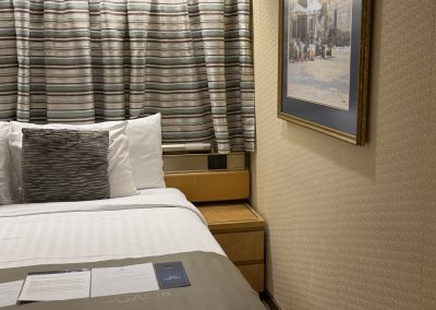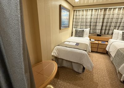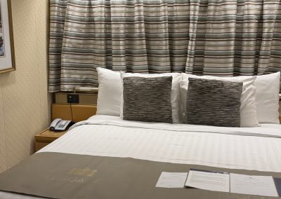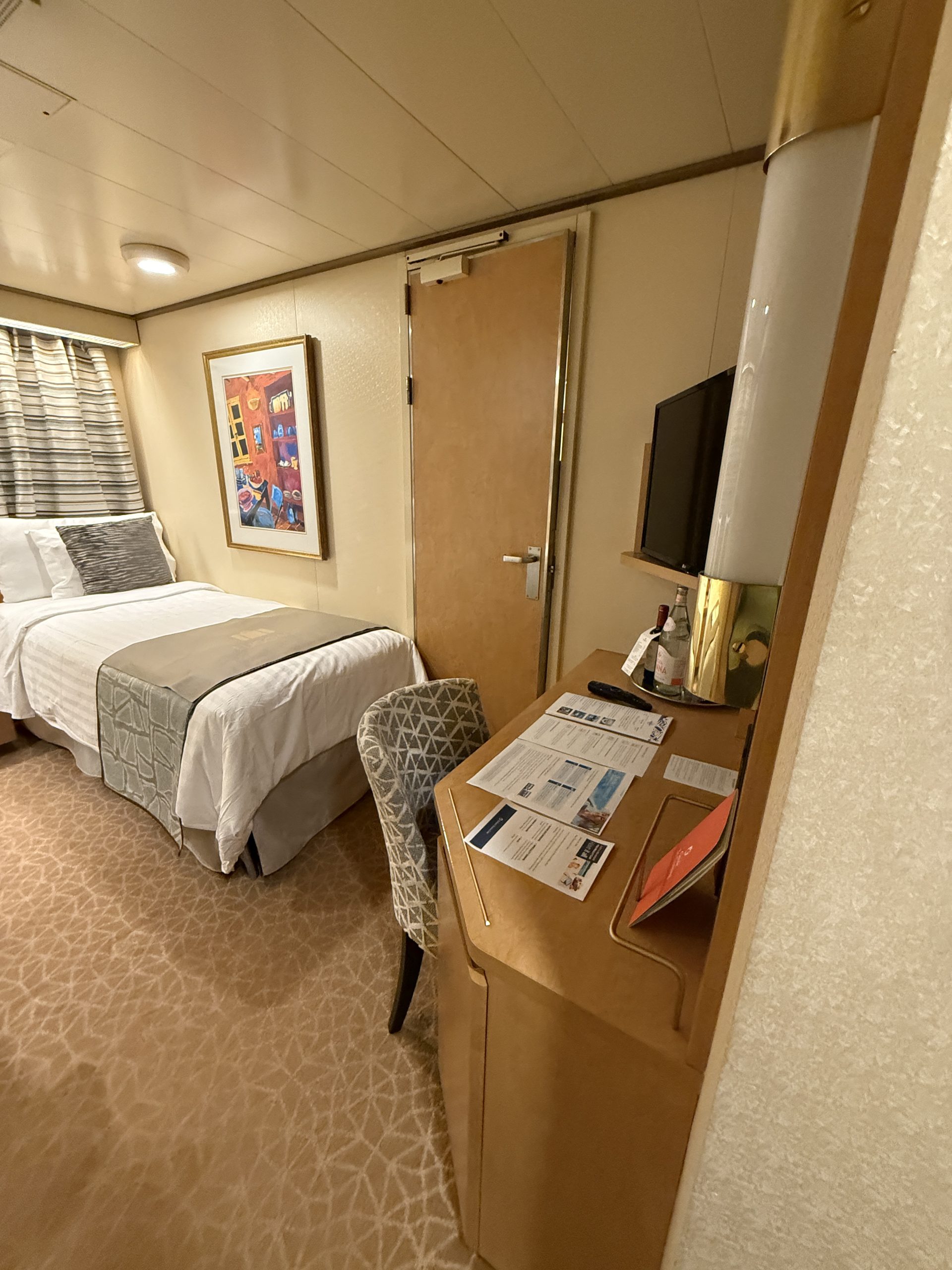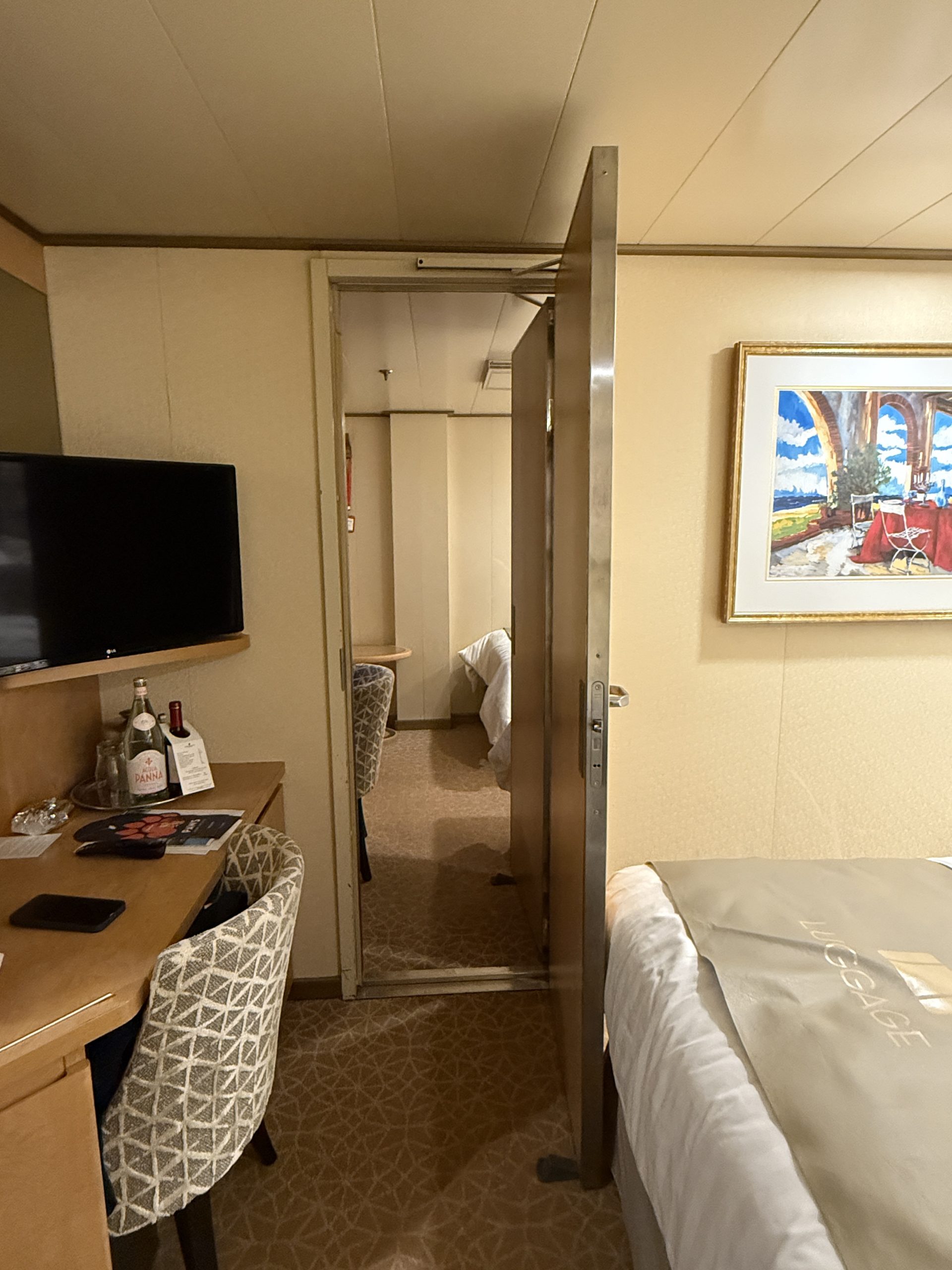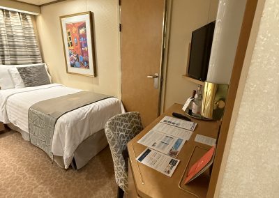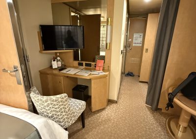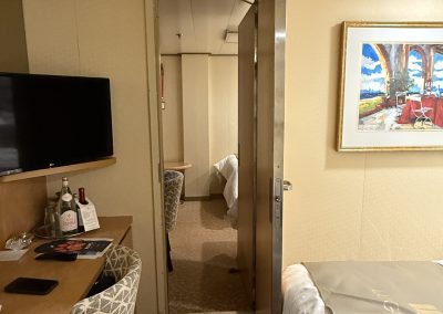 Let’s start with the basics, because these are interior staterooms, there is no balcony or view. The interior staterooms are decent size and measure approximately 170-207 sq. feet. However, the “connecting” feature is situated right near the desk and it’s virtually impossible to pass through the rooms when someone is seated at the desk. The “connecting” doors also do not open fully, so it’s also hard to view the TV when you have the “connecting” doors open.